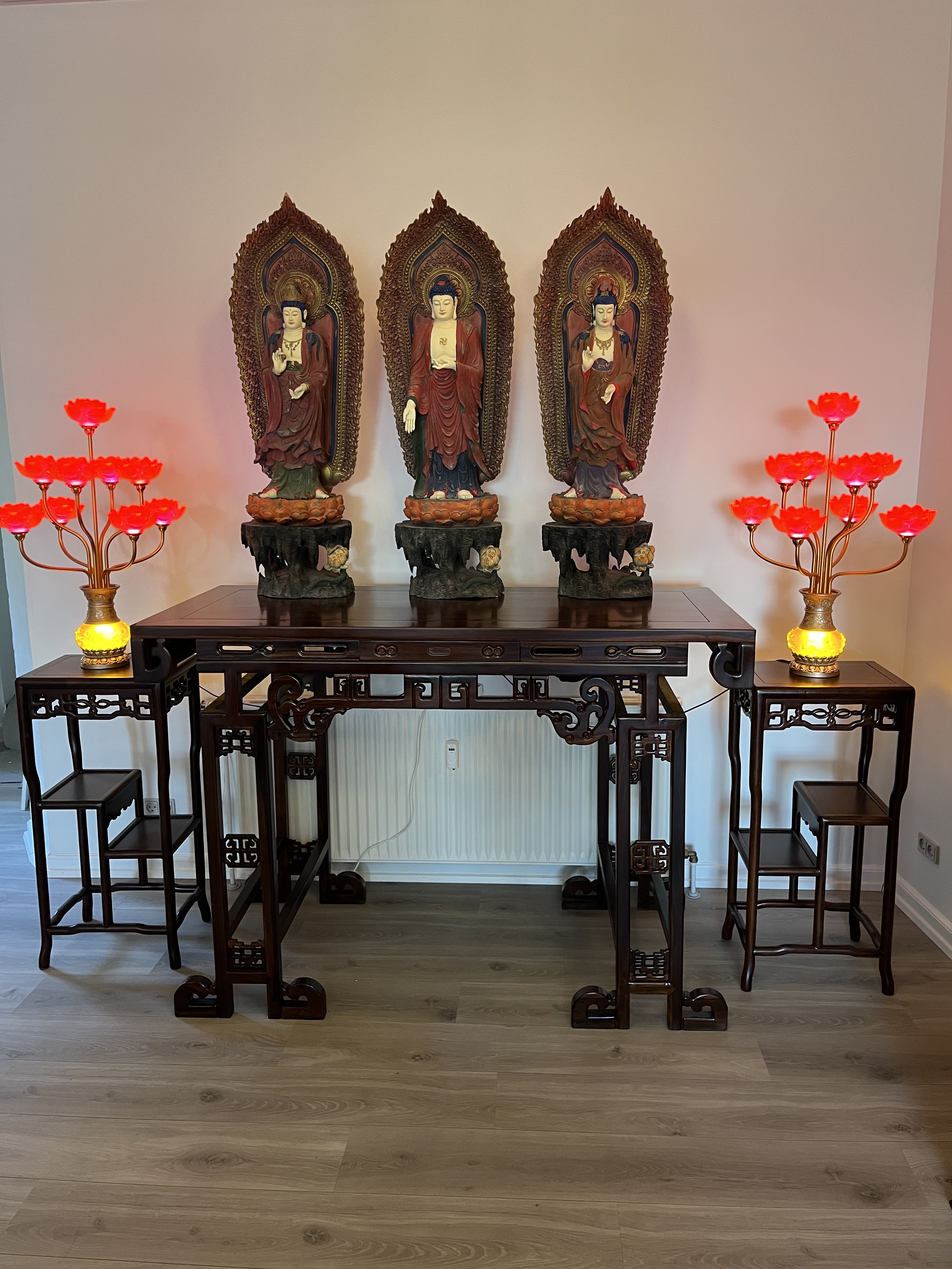 Buddha statuer i træ sæt af tre med opsats (bord samt andre pyntegenstande medfølger ikke)